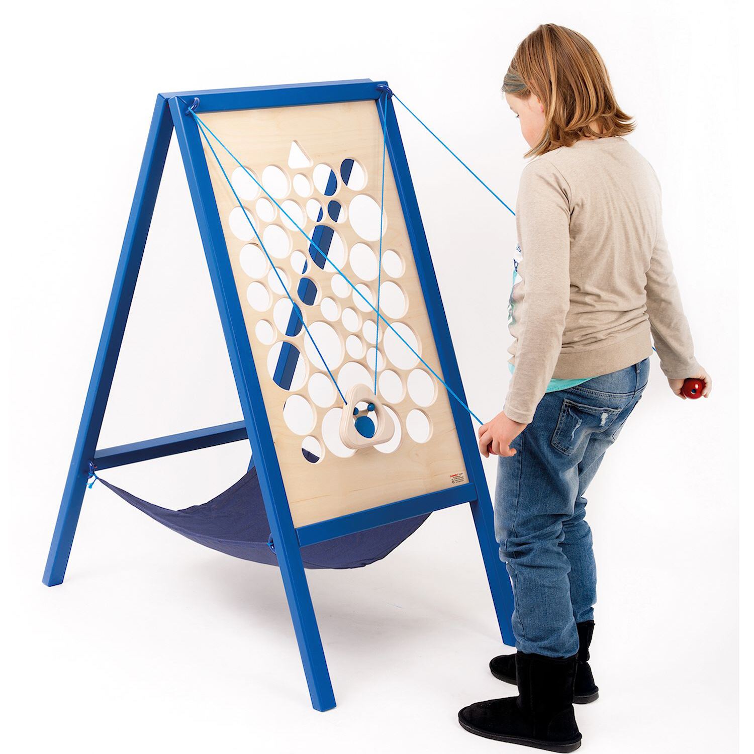 Das große Standspiel hat einen hohen Aufforderungscharakter: Es ist herausfordernd und spannend, die Holzscheibe (einfacher) oder die große Murmel (schwieriger) sicher über die schmalen Wege nach oben in das Ziel zu führen. Halten Kinder die Kordeln überkreuz, werden nicht nur linke und rechte Gehirnhälfte trainiert, es macht einfach viel Spaß und weckt den Ehrgeiz. Natürlich können auch zwei Kinder zusammenspielen - z.B. mit anderen Spielpaaren im Wettkampf.