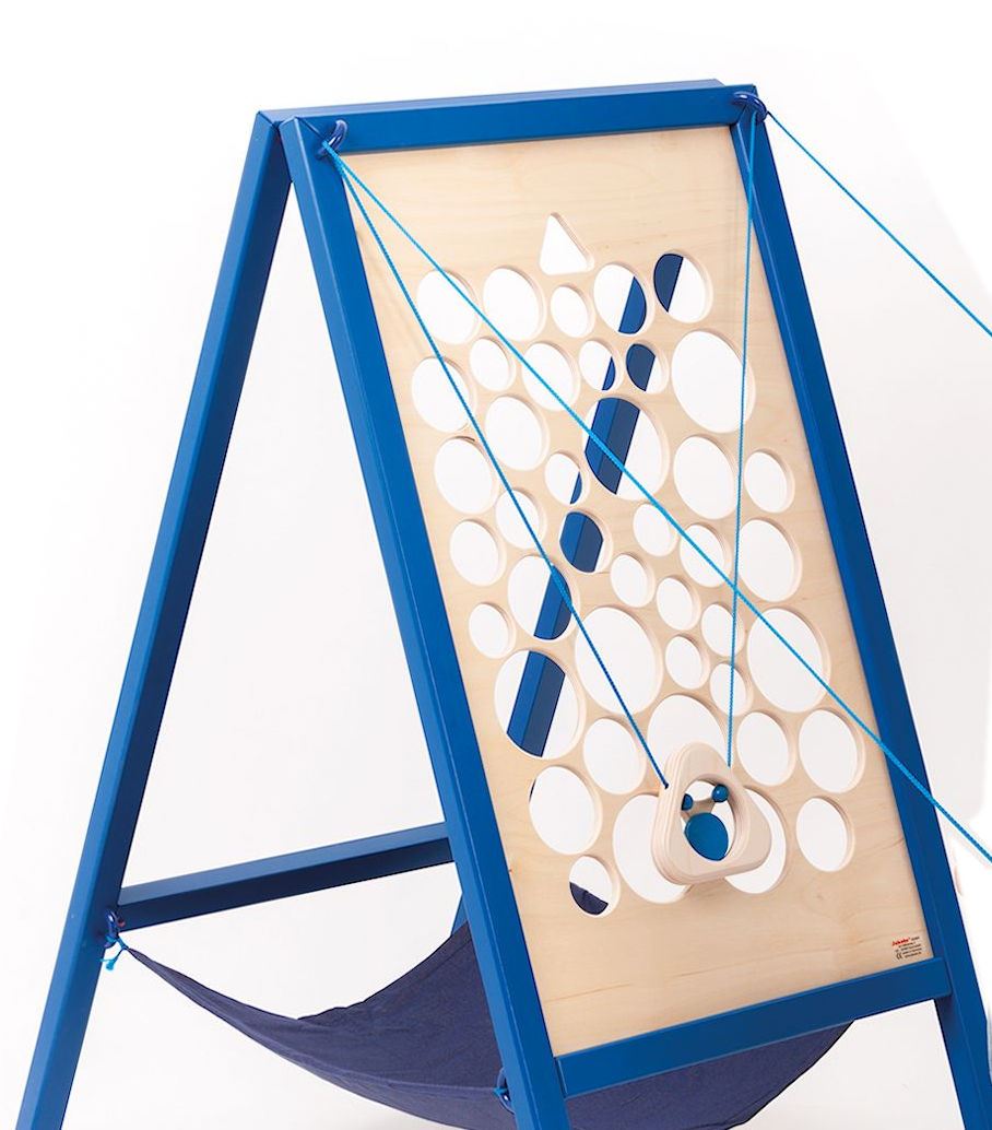 Standspiel aus Birkenleimholz mit ausklappbarem, blauen Ständer
