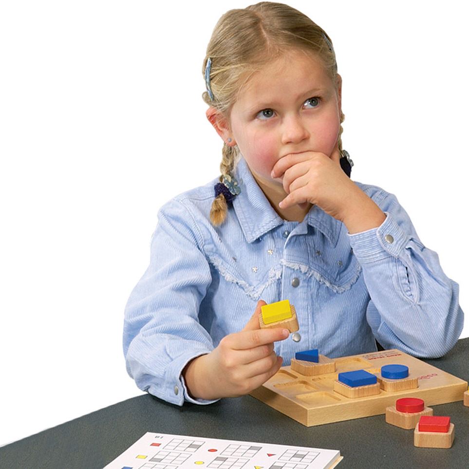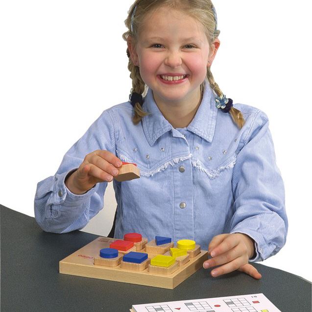 Didaktisches Holzspiel (ca. 20 x 15 cm) mit 9 abgerundeten Buchenquadern, 3 verschiedenen geometrischen Formen in 3 Farben und einem umfangreichen und detaillierten Vorlagenheft inklusive Anleitung und Spielaufbau, verpackt im stabilen Klappkarton.