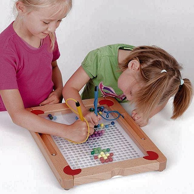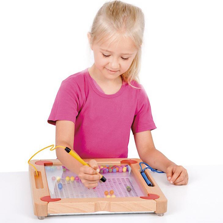 Das Magnetspiel bietet mit verschiedenen und auswechselbaren Vorlagekarten ein großes Spektrum unterschiedlicher Spielinhalte und Herausforderungen. Im geschlossenen System liegen 81 Farbkugeln, zu gleichen Anteilen in 9 unterschiedlichen Farben. 14 Vorlagekarten zum Einsetzen bzw. Auswechseln aus abwaschbarem, bruchfestem Kunststoff-Material sind beidseitig bedruckt: