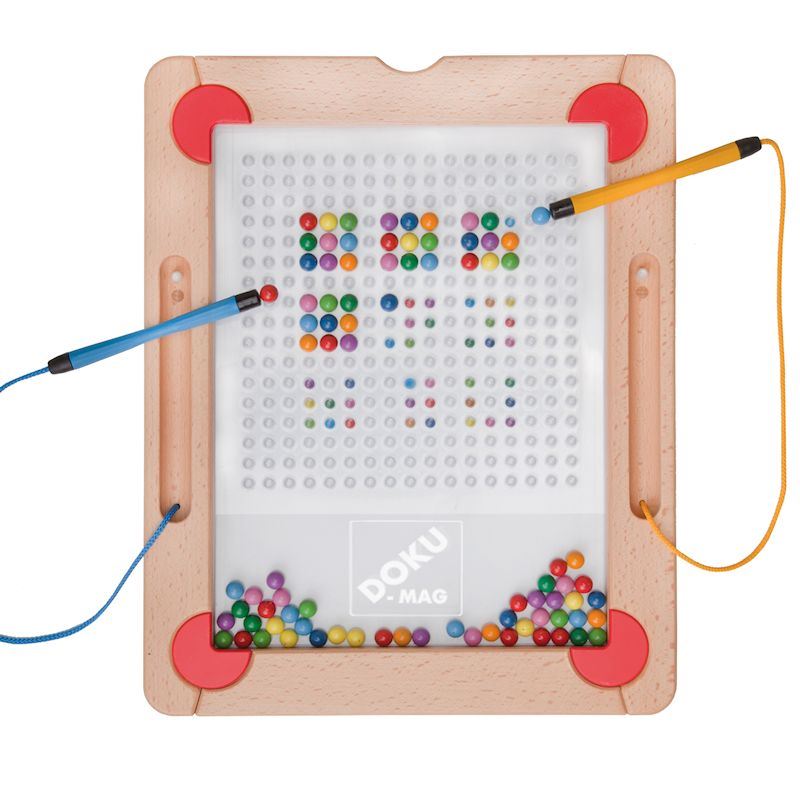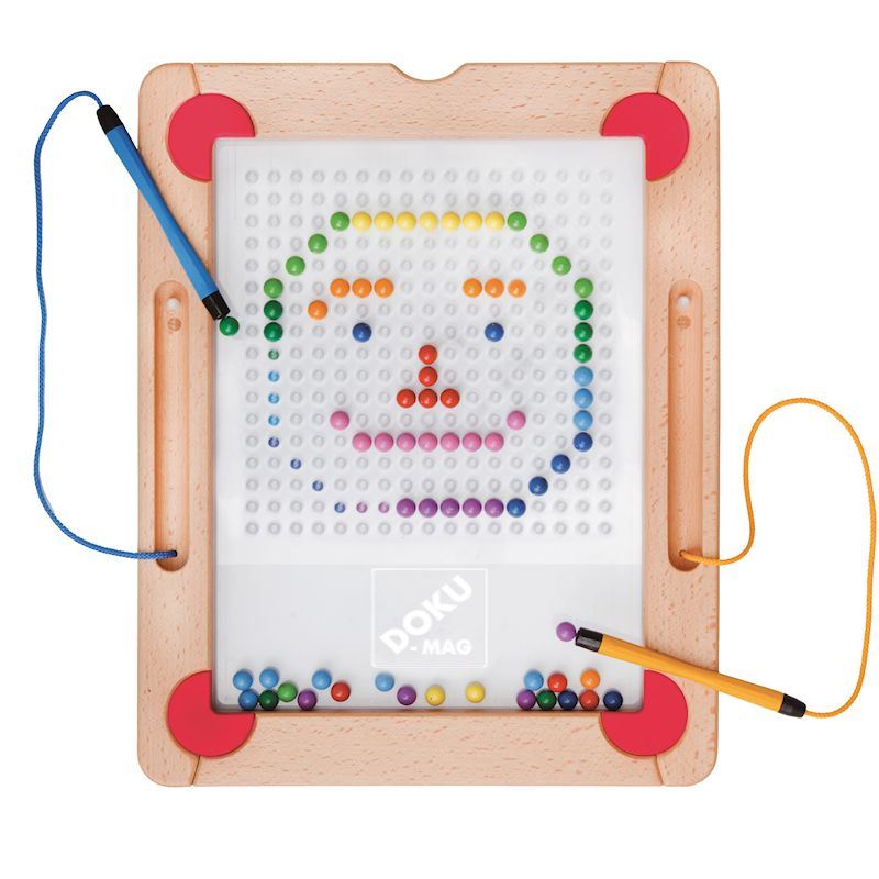 Das Magnetspiel Doku-Mag, bietet mit 14 verschiedenen, auswechselbaren Vorlagekarten ein großes Spektrum unterschiedlicher Spielinhalte und Herausforderungen. Das geschlossene Spielsystem mit transparenten Deckplatten hält 81 Farbkugeln immer spielbereit.