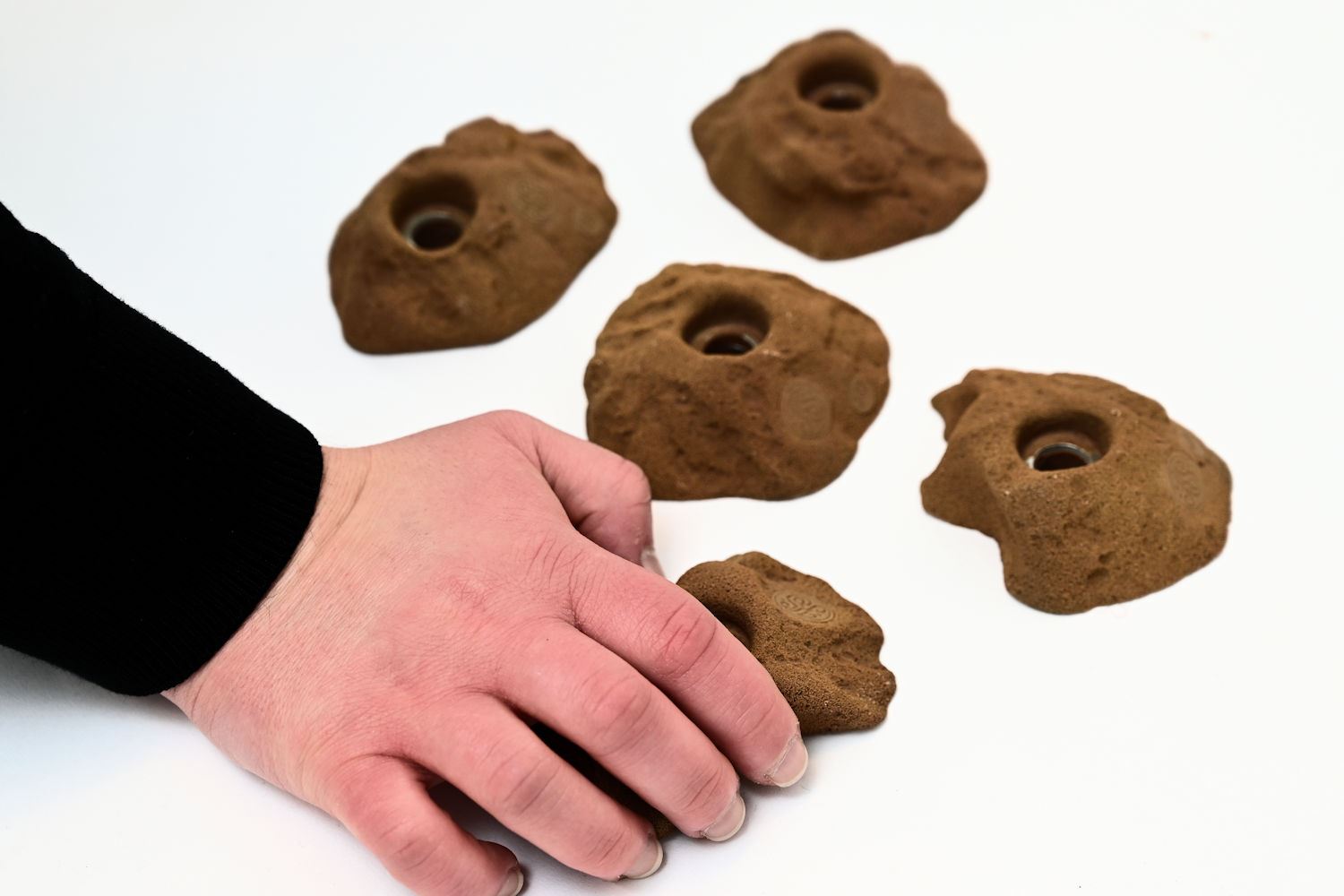 Kleine Sport-Klettergriffe in Sandsteinoptik für geübte Kletterer. Die Griffe in braun/beige kommen der Natur sehr nahe. Die Herstellung unserer Klettergriffe erfolgt komplett in Deutschland nach der europaweit gültigen DIN-Norm für Klettergriffe. Damit sind die höchsten Standards bezüglich der Qualität zuverlässig erfüllt.