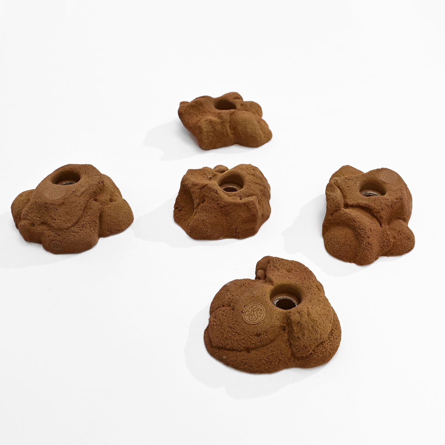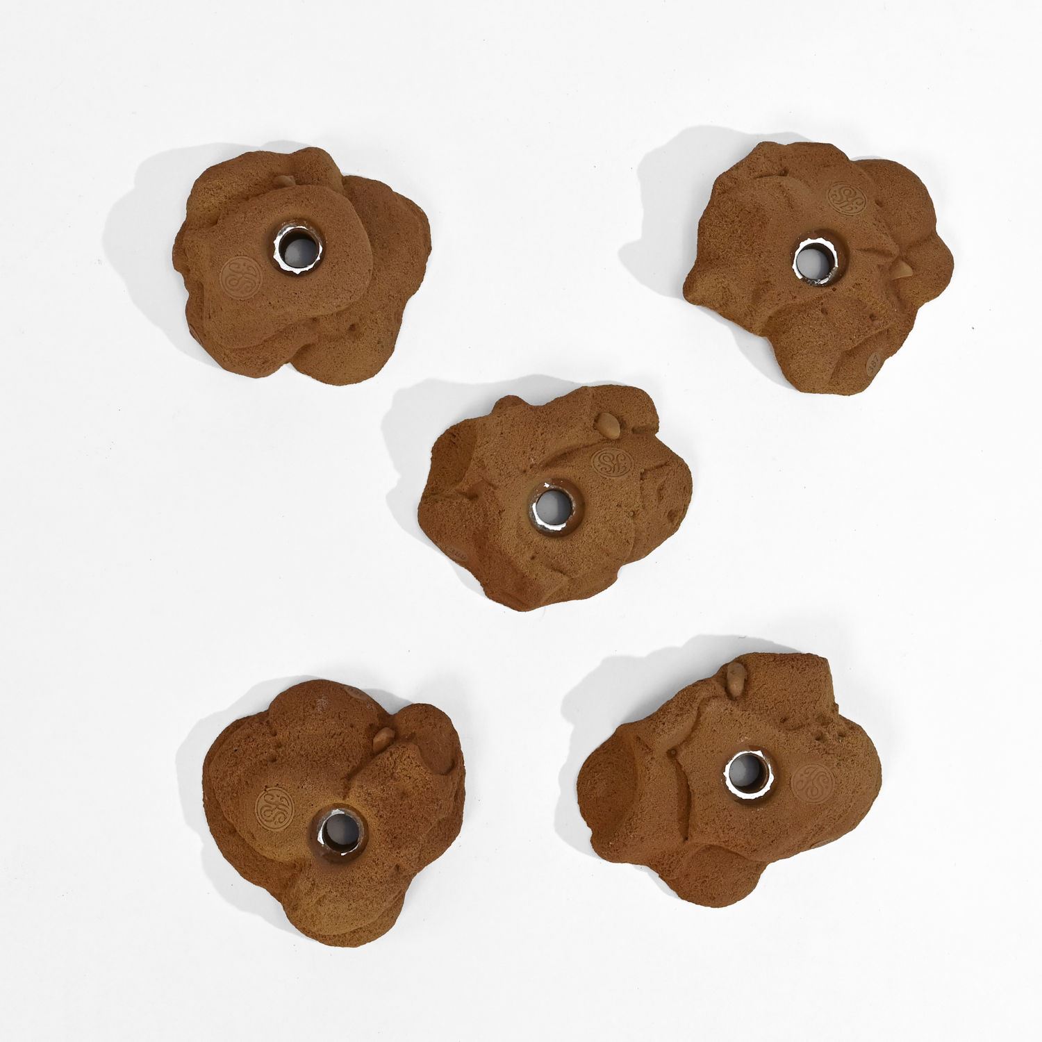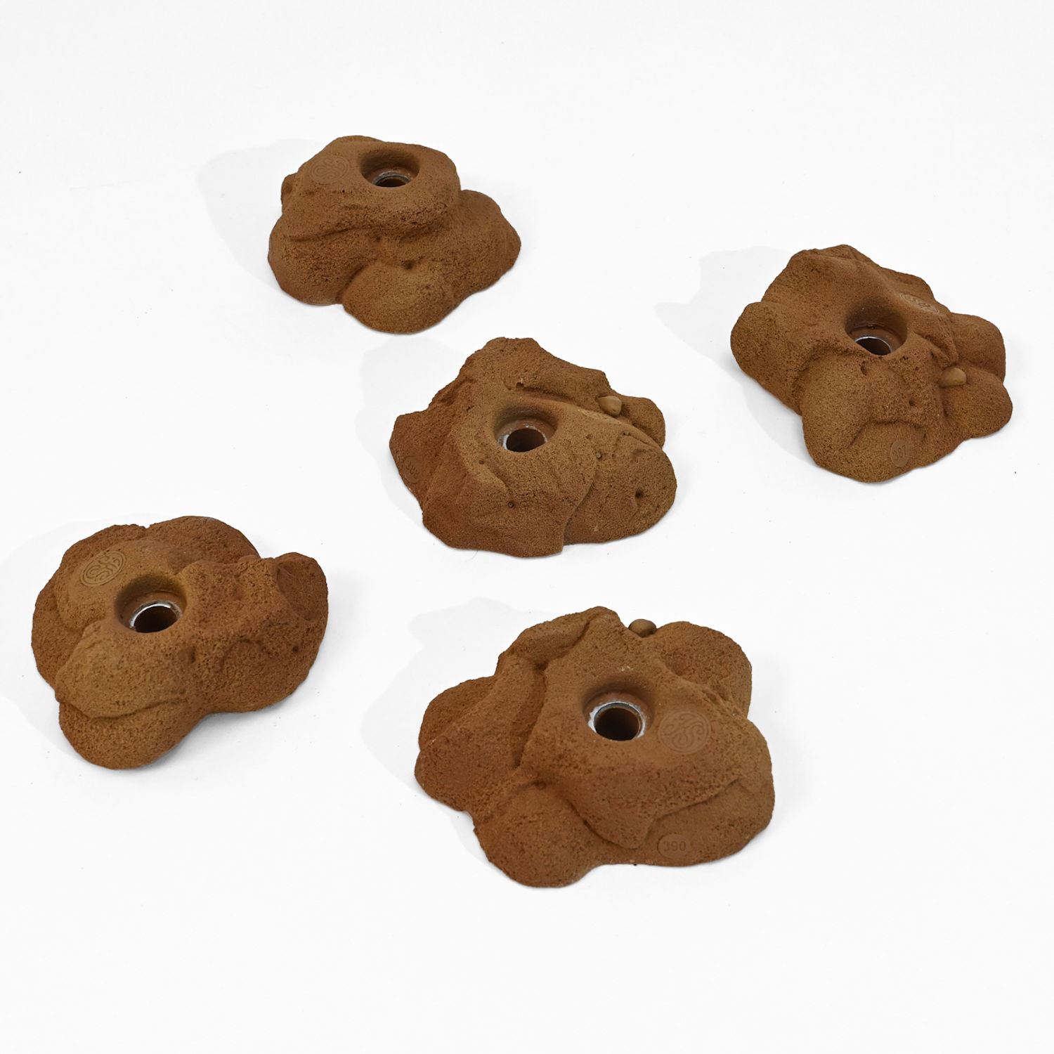 Ein 5-teiliges Klettergriffe-Set in Sandsteinoptik - Größe M. Die Griffe in braun/beige kommen der Natur sehr nahe. Die Herstellung unserer Klettergriffe erfolgt komplett in Deutschland nach der europaweit gültigen DIN-Norm für Klettergriffe. Damit sind die höchsten Standards bezüglich der Qualität zuverlässig erfüllt.