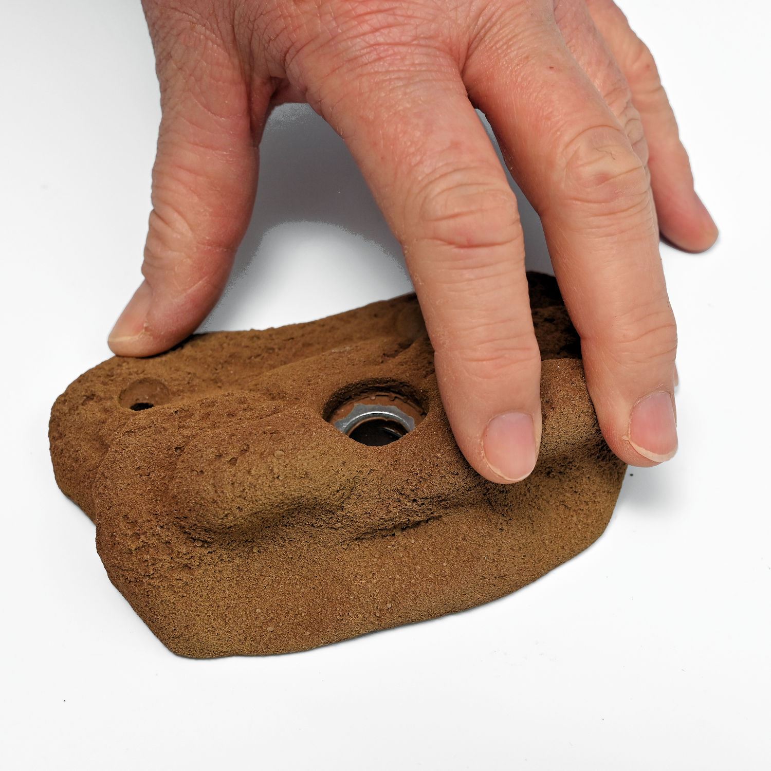 Klettergriffe Größe L in Sandsteinoptik für geübte Kletterer. Die Griffe in braun/beige kommen der Natur sehr nahe. Die Herstellung unserer Klettergriffe erfolgt komplett in Deutschland nach der europaweit gültigen DIN-Norm für Klettergriffe. Damit sind die höchsten Standards bezüglich der Qualität zuverlässig erfüllt.