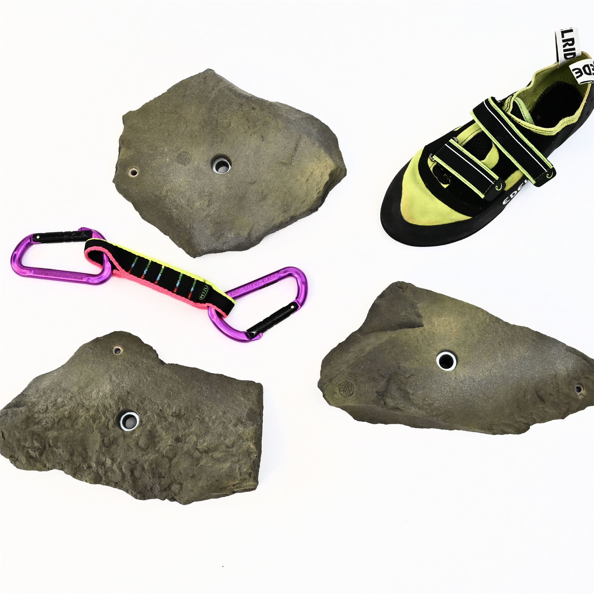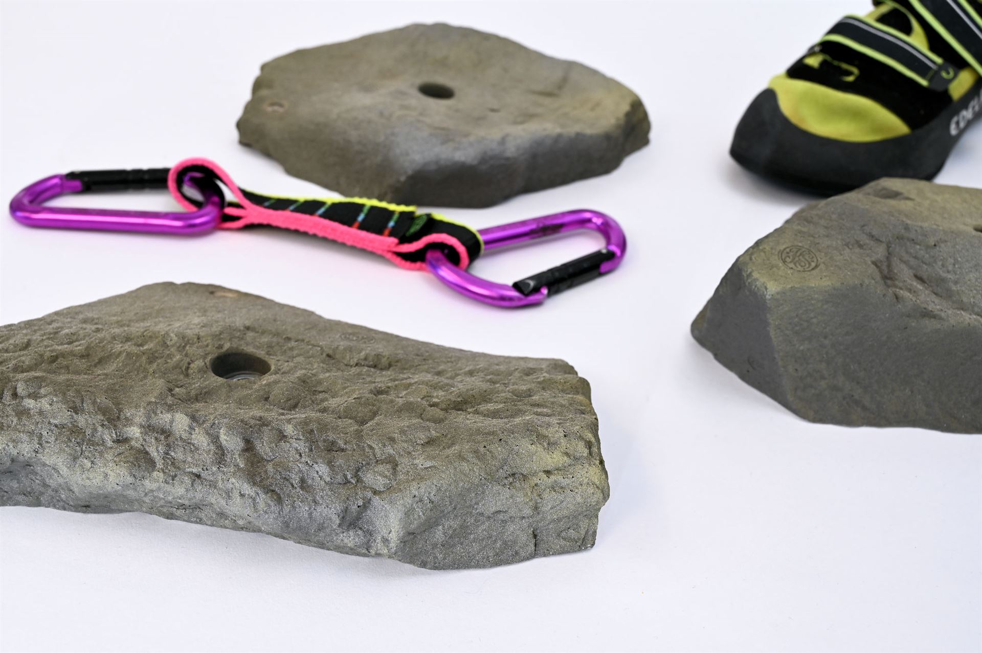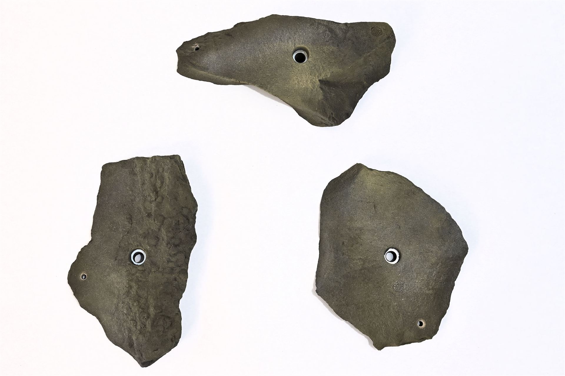 Diese drei riesen großen gräulichen Klettergriffe in Natursteinoptik bringen das Echt-Fels-Kletter-Feeling an die Kletterwand. Kein Griff ist nach Maß sondern hat natürlich geformte Ecken und Kanten. Das Klettergriffe-Set eigenet sich sowohl für Kletterhallen als auch für Outdoor-Kletterwände.