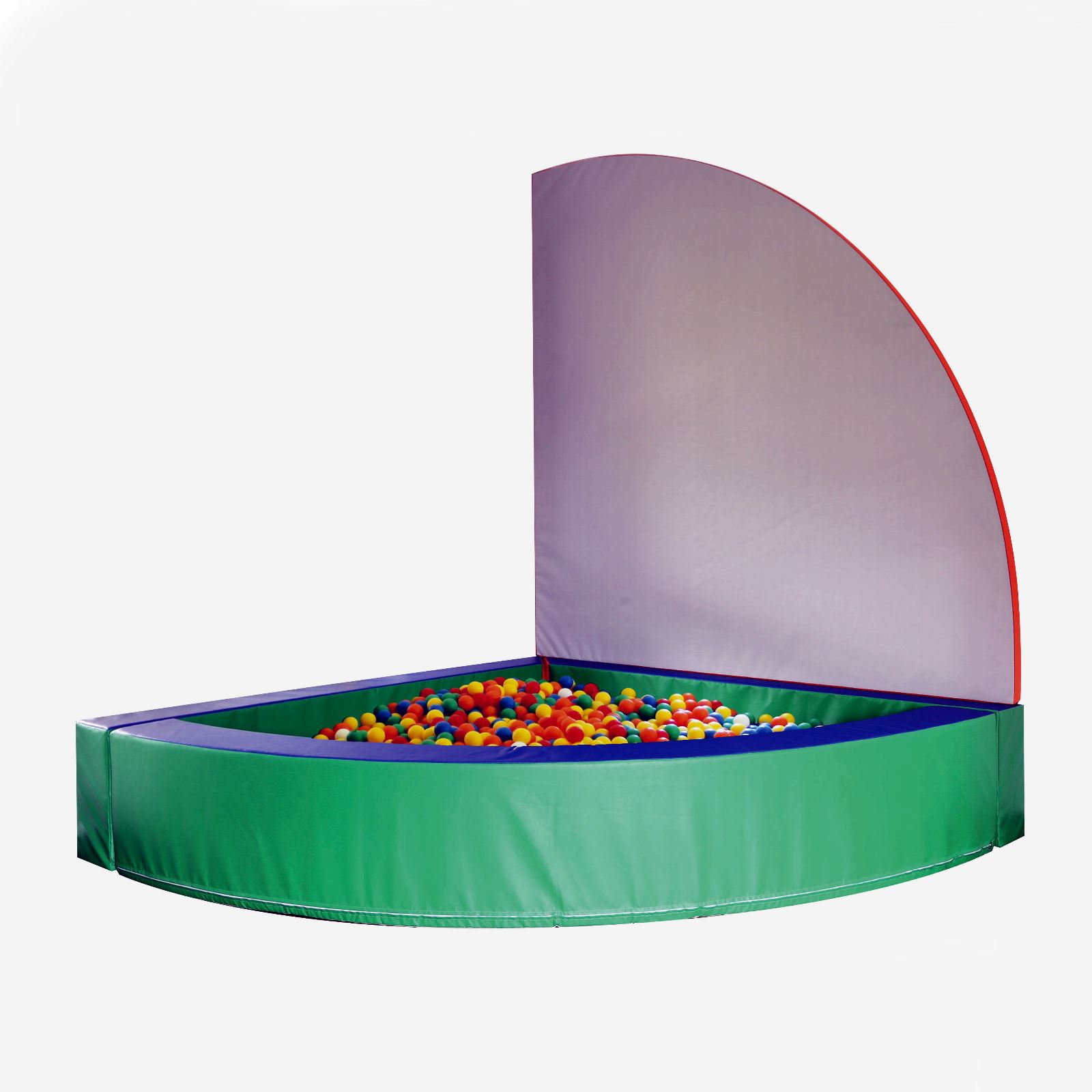 Das große Viertelkreis-Ballbad wird natürlich vorrangig als Ballbad genutzt. Durch die Abdeckung kann aber auch eine ruhige Spielatmosphäre geschaffen werden. Ebenfalls kann die Abdeckung als Schlafplatz genutzt werden oder aber auch als Spiel- und Tobematte.