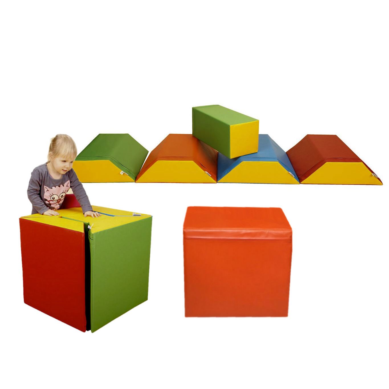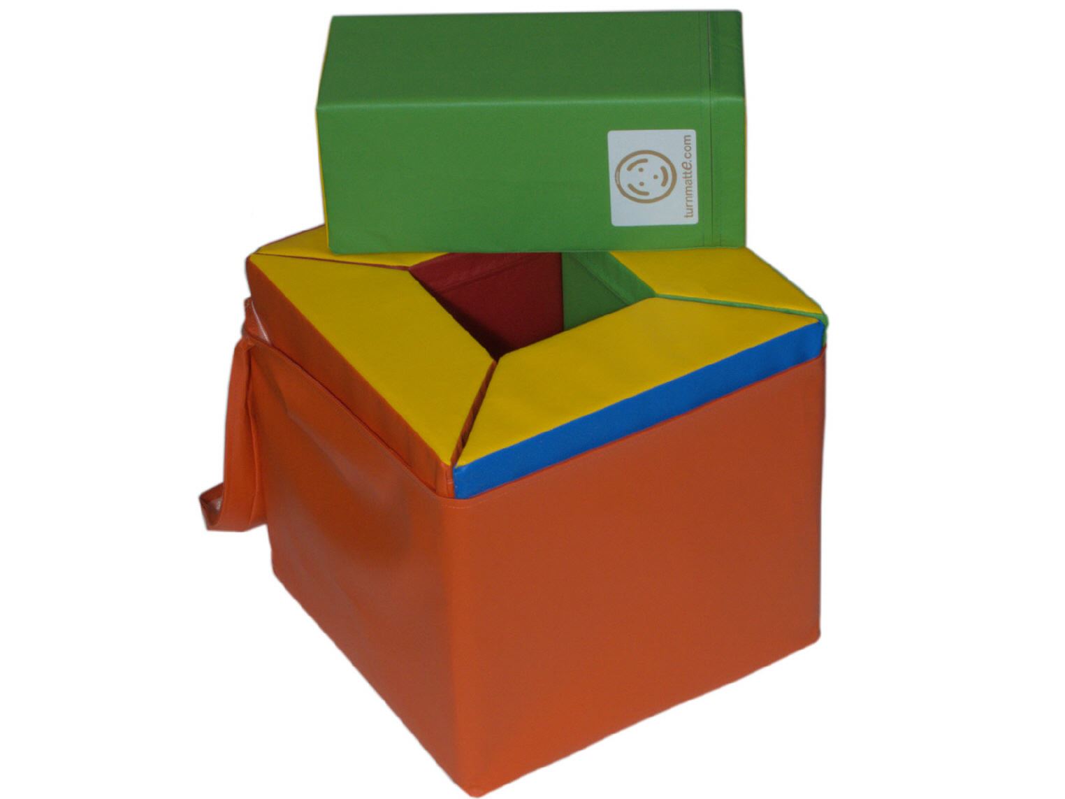 Fügt man die 4 einzelnen Trapezelemente mit dem Zylinder zusammen und verstaut sie im orangenen Bezug, so erhält man einen stabilen Sitzwürfel. Mit ein wenig Geschick schaffen das die Kinder im Teamwork auch alleine. So wird auf spielerische Art sowohl der Lerneifer als auch der Teamgeist gefördert.