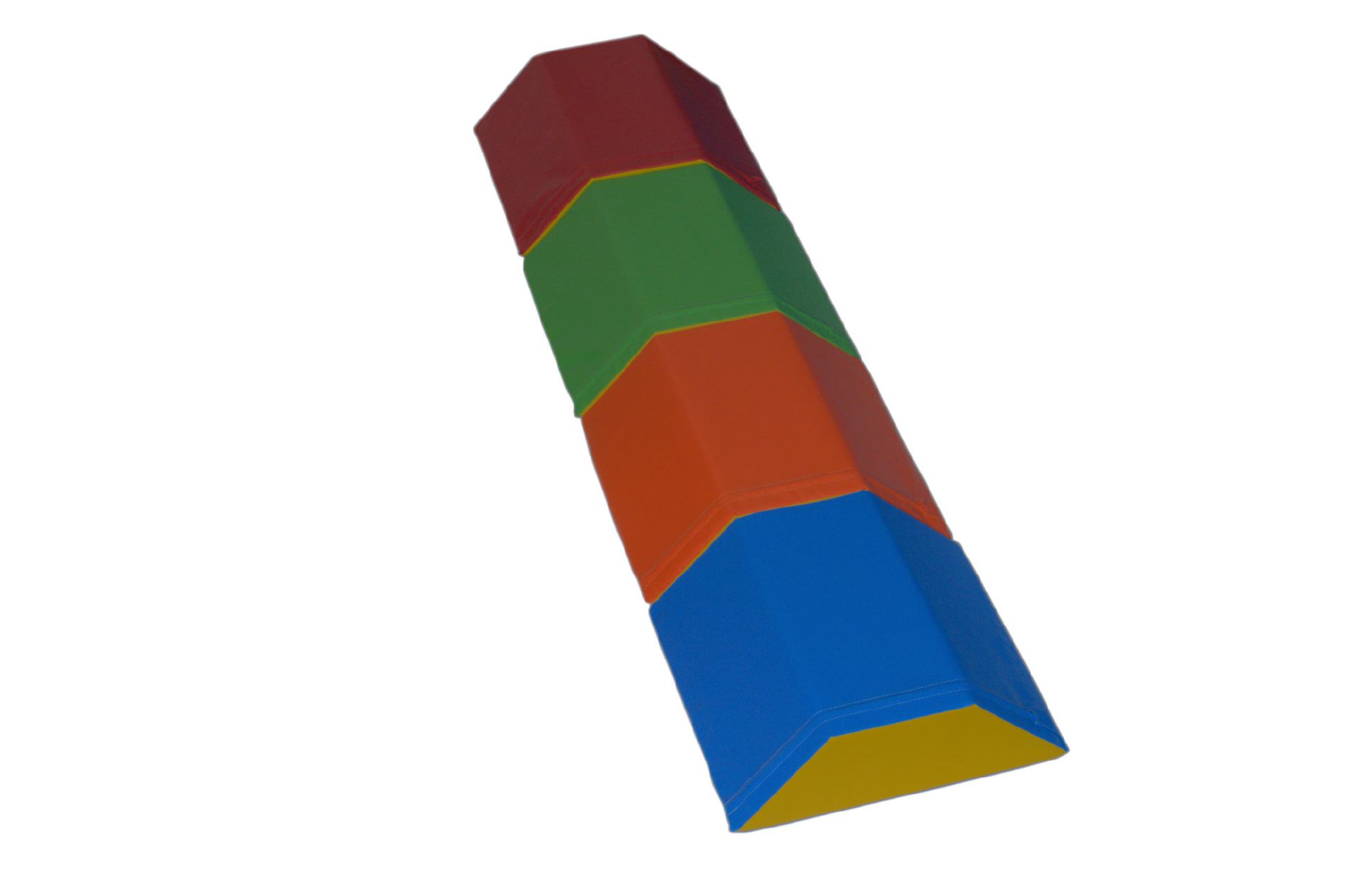 Die einzelnen Trapez-Elemente können zusammengesteckt als Sitzwürfel umfunktioniert werden. Das Besondere an dem Bausteinsatz: die Kerne der einzelnen Trapez-Elemente haben unterschiedliche Härtegrade. Der Gleichgewichtssinn beim Balancieren wird so bei den Kindern besonders gut gefördert.