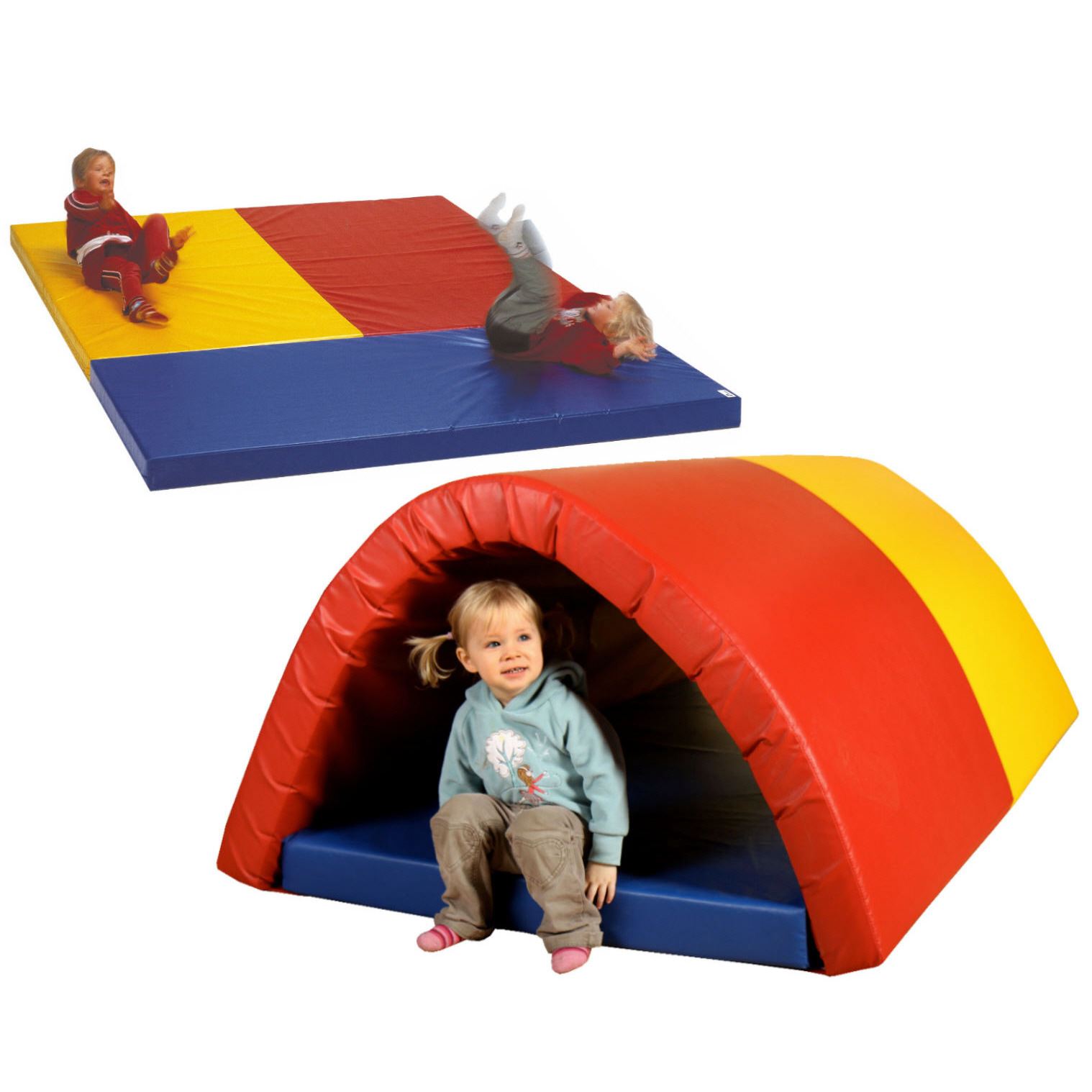 Als Tunnel nutzbar - oder auseinander genommen hat man eine große Turn- und Spielfläche. Eingesetzt werden kann dieses Baumodul überall: in der Kindertagesstätte, Hort, Schule, Spielgruppe, Warteraum, Therapie und natürlich privat.