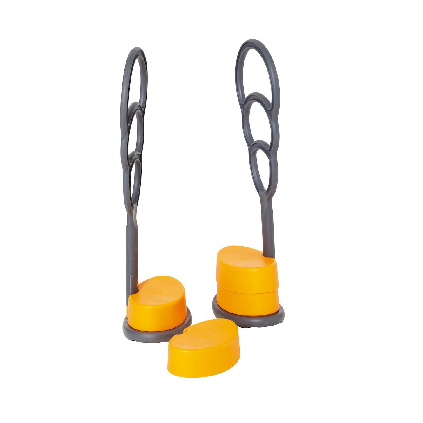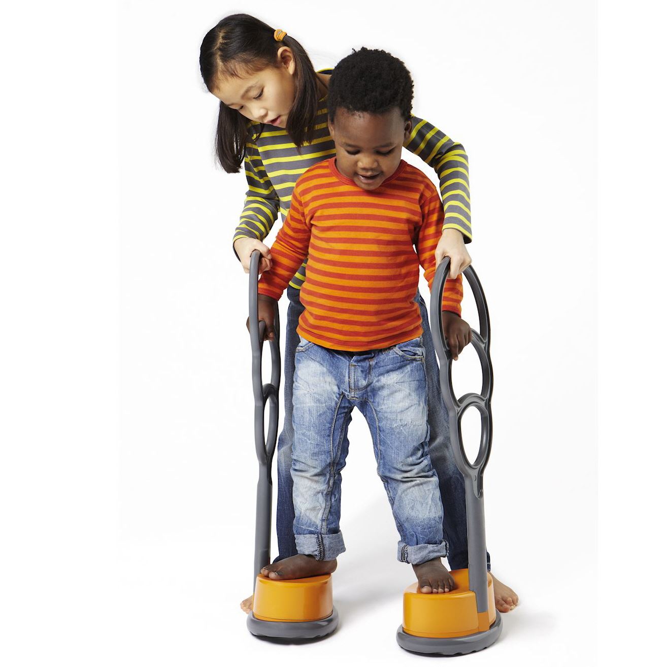 Die Griffe aus Hartgummi bieten festen Halt - individuell angepasst an die Größe des Kindes. Durch die spezielle Form der Griffe können größere Kinder oder Erwachsene den kleinen Kindern helfen das Stelzenlaufen zu lernen.