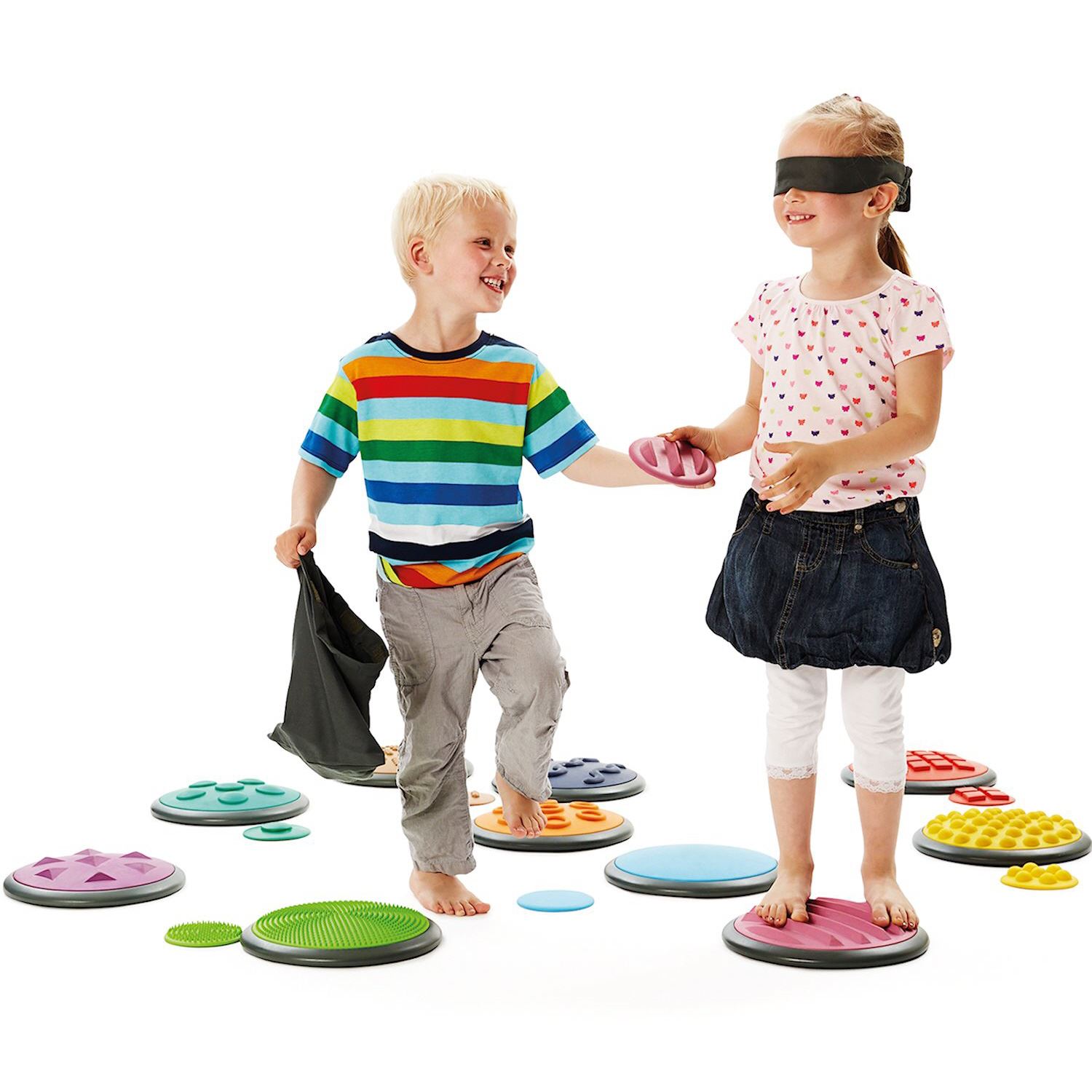 Markant strukturiertes, taktiles Material, das den Tastsinn der Kinder an Händen und Füßen herausfordert, gleichzeitig wird die Fähigkeit gefördert, Sinneseindrücke verbal zu beschreiben. Jede Struktur findet sich auf einer großen Scheibe, die auf den Boden gelegt werden können (für die Füße), sowie auf einer kleinen Scheibe, die in den Händen gehalten wird.