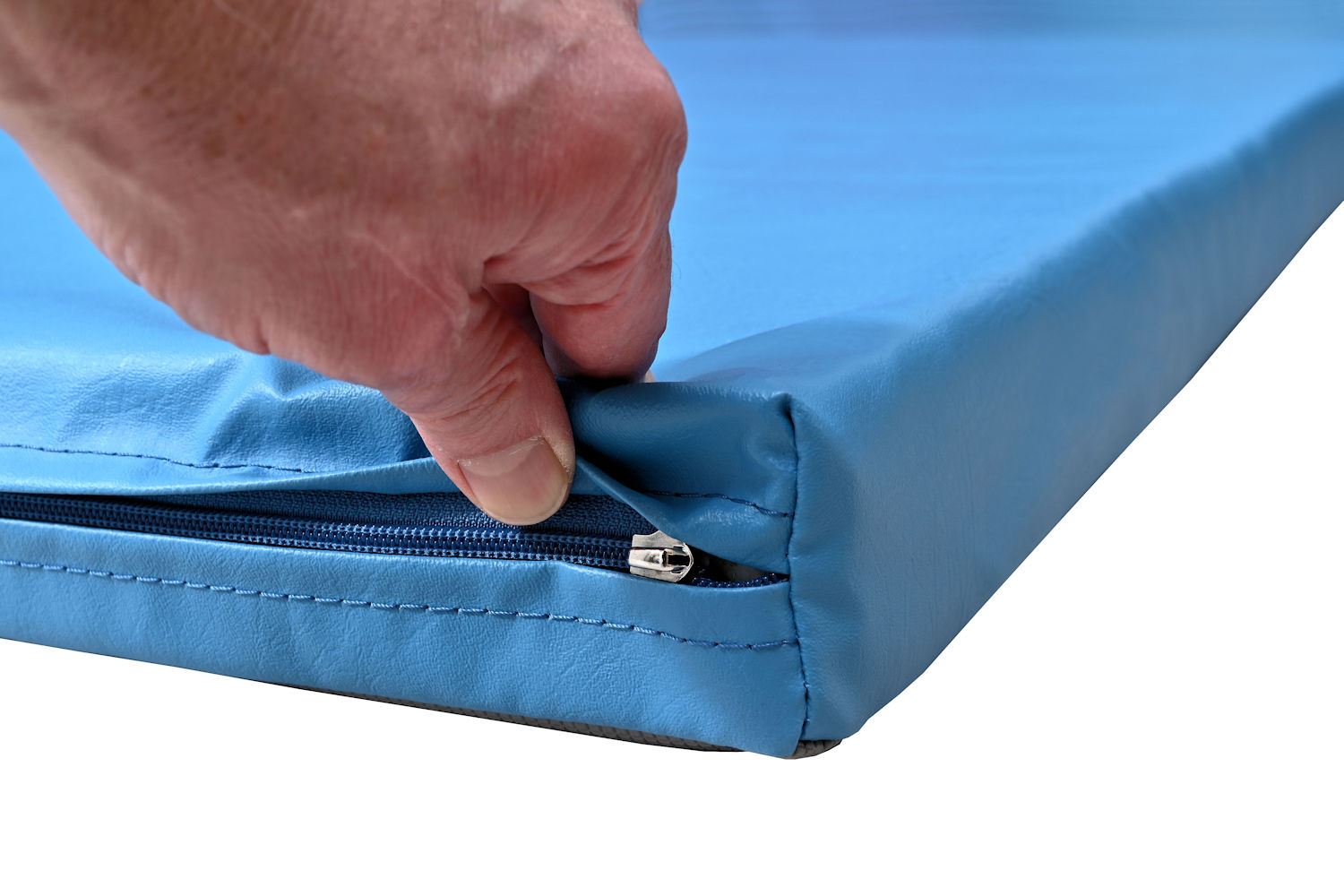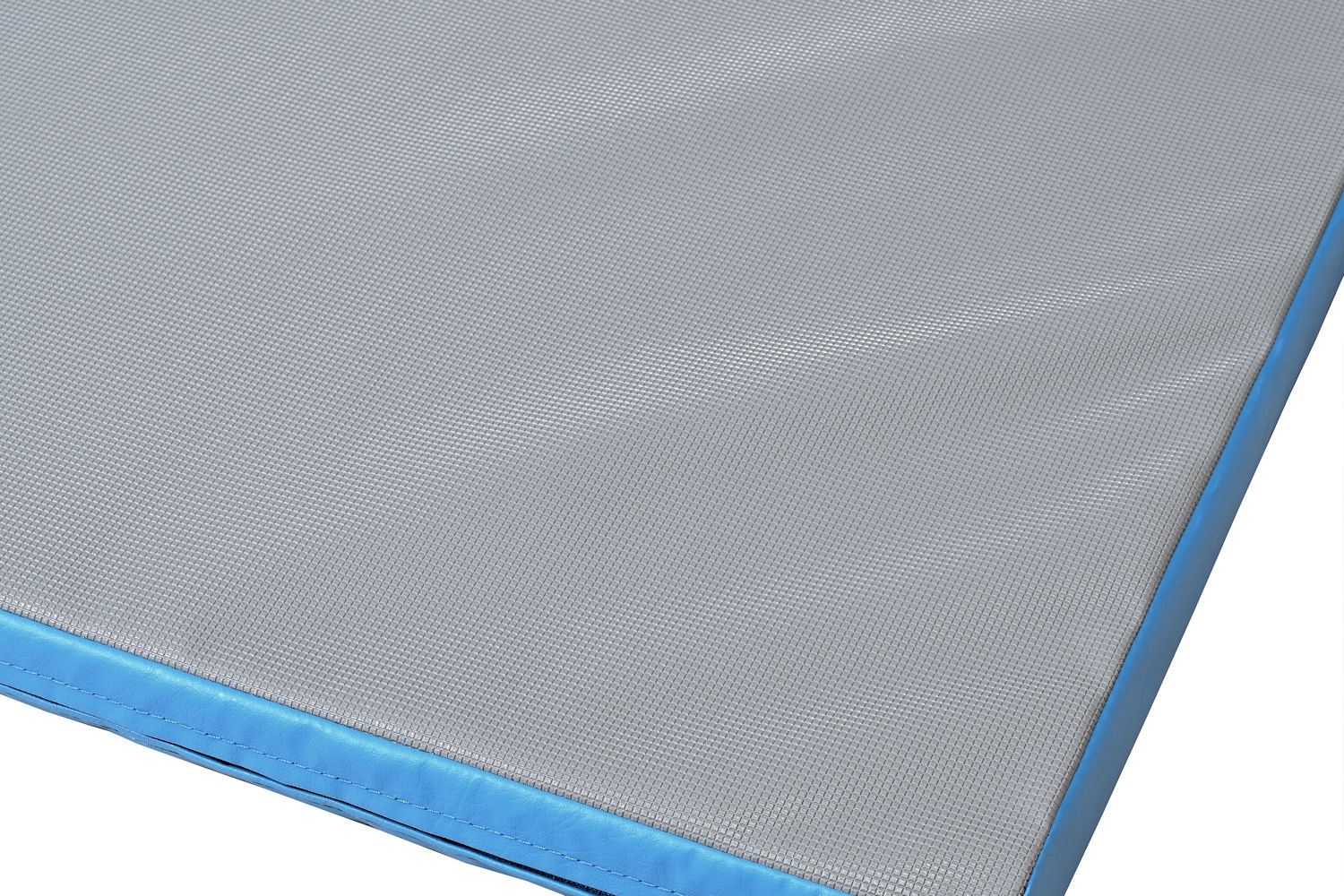 Der farbige Bezug der Fallschutzmatten wird aus einem unempfindlichen Leichtplanenstoff gefertigt und besitzt eine angenehme Haptik und lange Lebensdauer. Das spezielle Material an der Unterseite hat rutschhemmende Eigenschaften. Damit ist eine gute Standfestigkeit - auch bei extremen Gebrauch - garantiert.