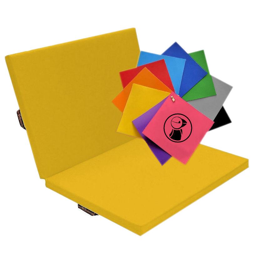Gelbe Standard-Turnmatte in faltbarer Ausführung, welche zur platzsparenden Aufbewahrung in der Mitte 1x zusammengeklappt werden kann. Die 150 x 100 cm große Faltmatte wird nach Ihrer individuellen Auswahl gefertigt.
