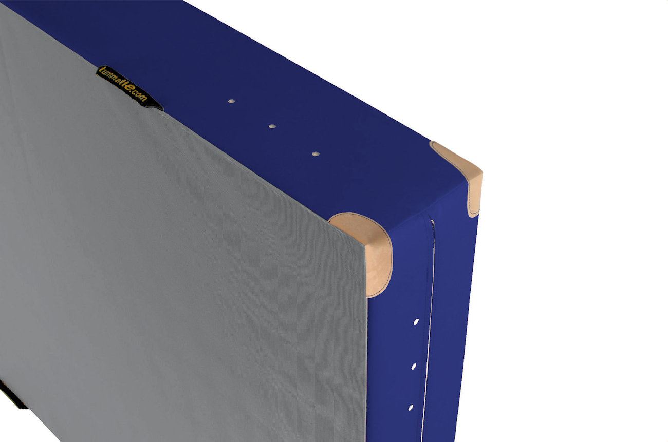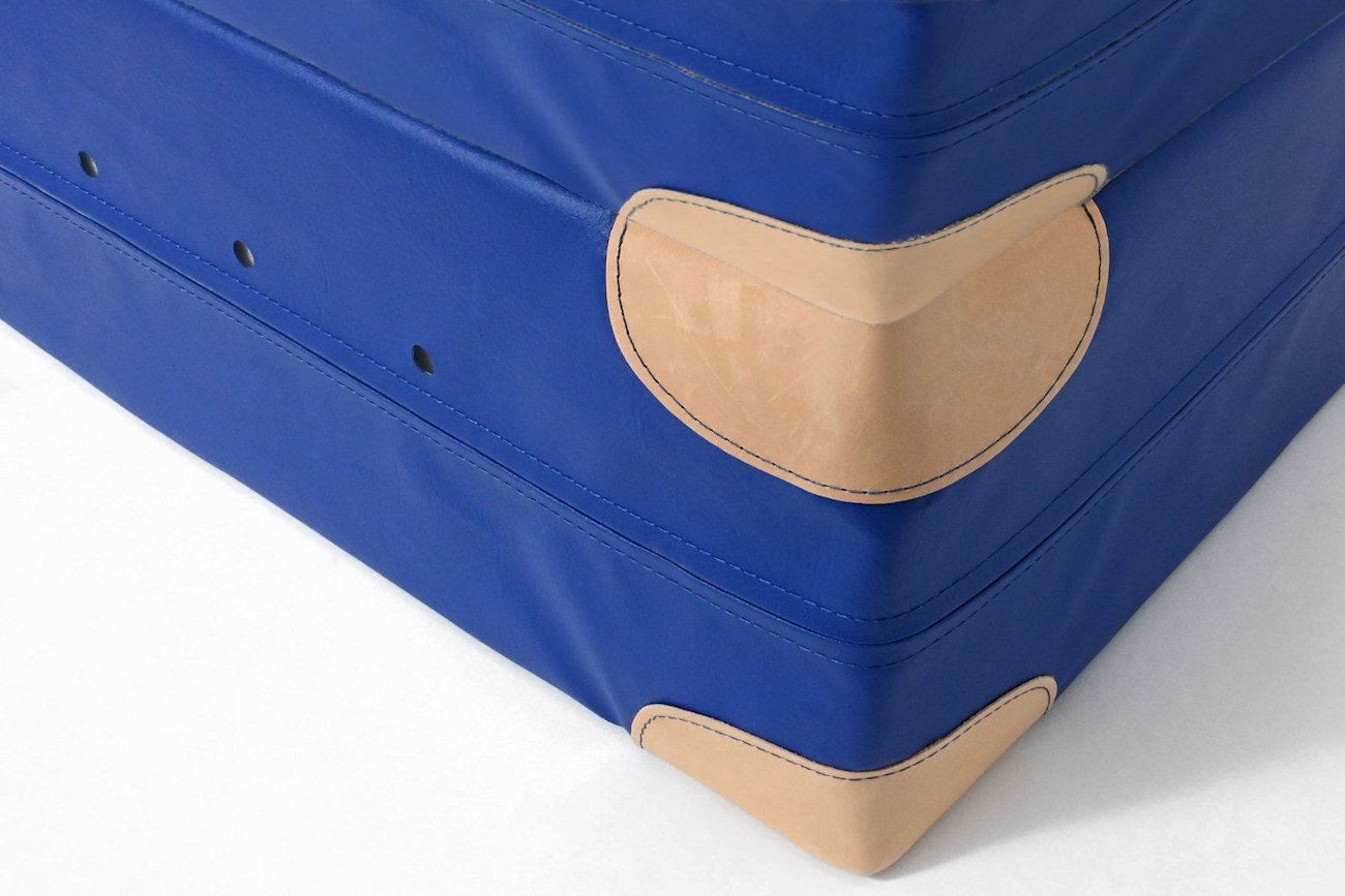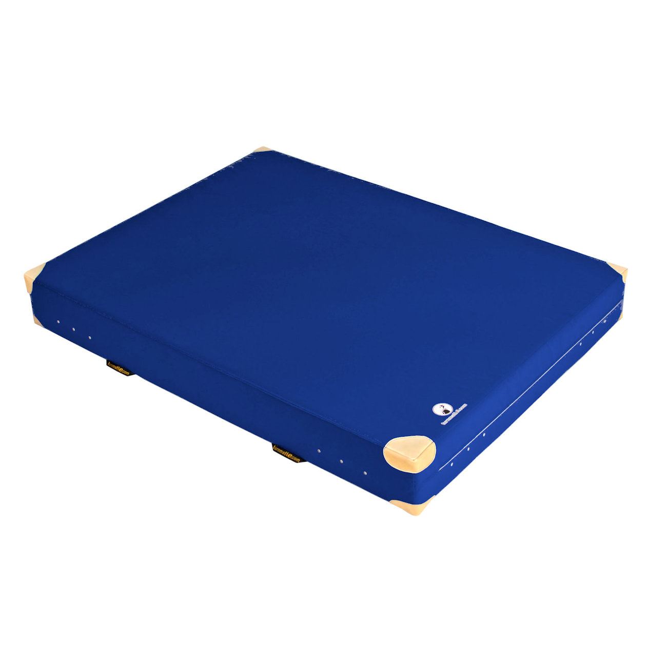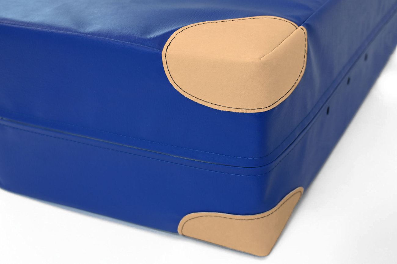 Die aus Echtleder geschützten acht Ecken der Weichbodenmatte sorgen für eine besonders lange Lebensdauer. Unsere klassische Weichbodenmatte in dunkelblau ist vielseitig einsetzbar und bietet Sicherheit beim Toben und Turnen. Die robuste 200 x 100 cm große Matte wird nach Ihrer individuellen Auswahl gefertigt.